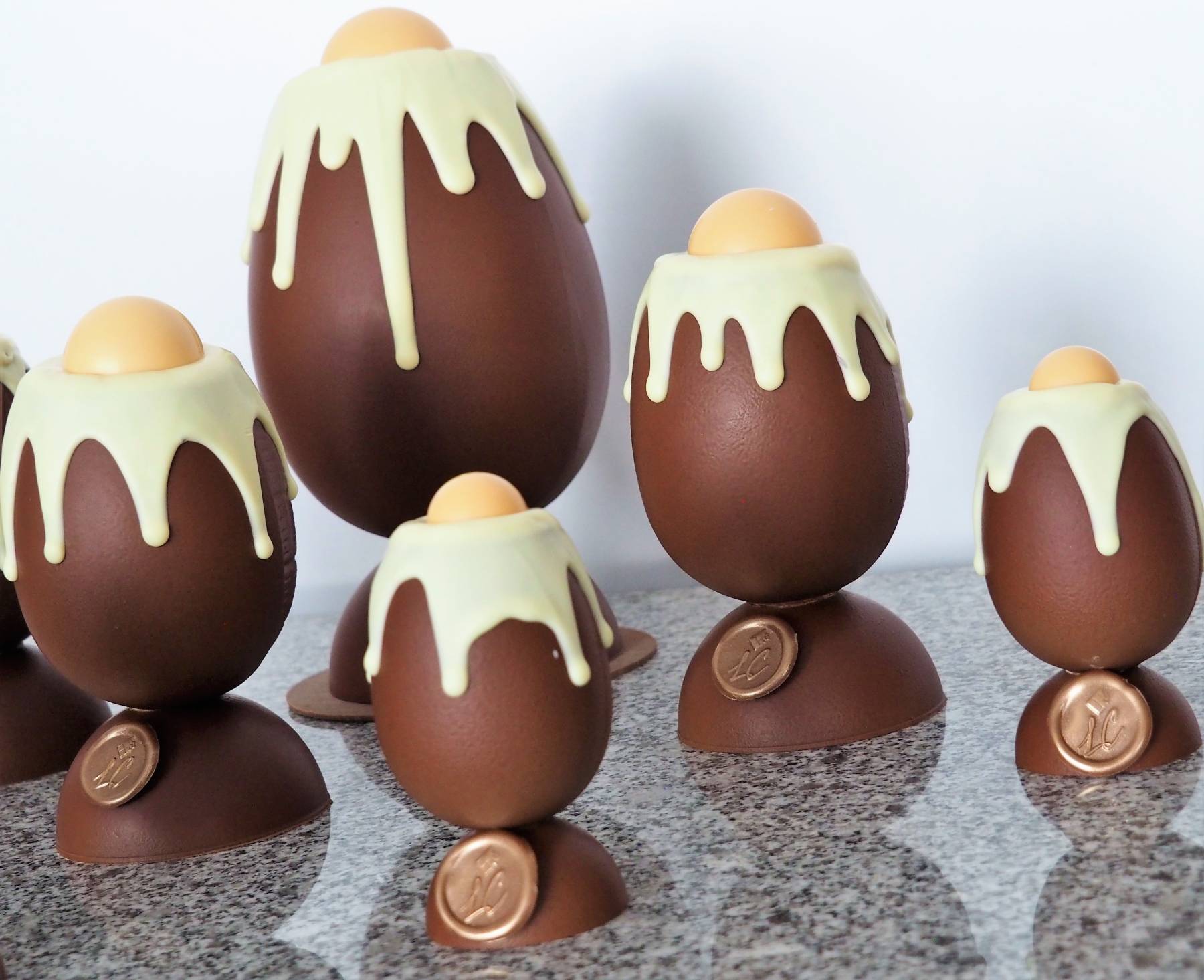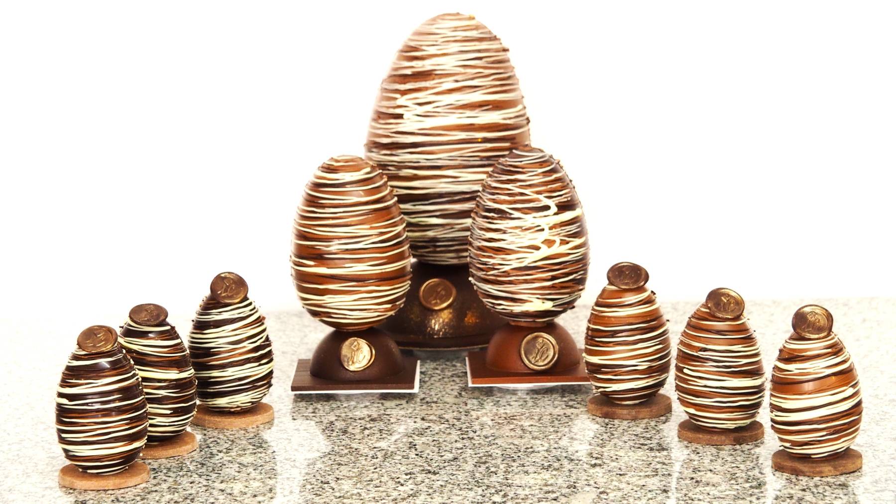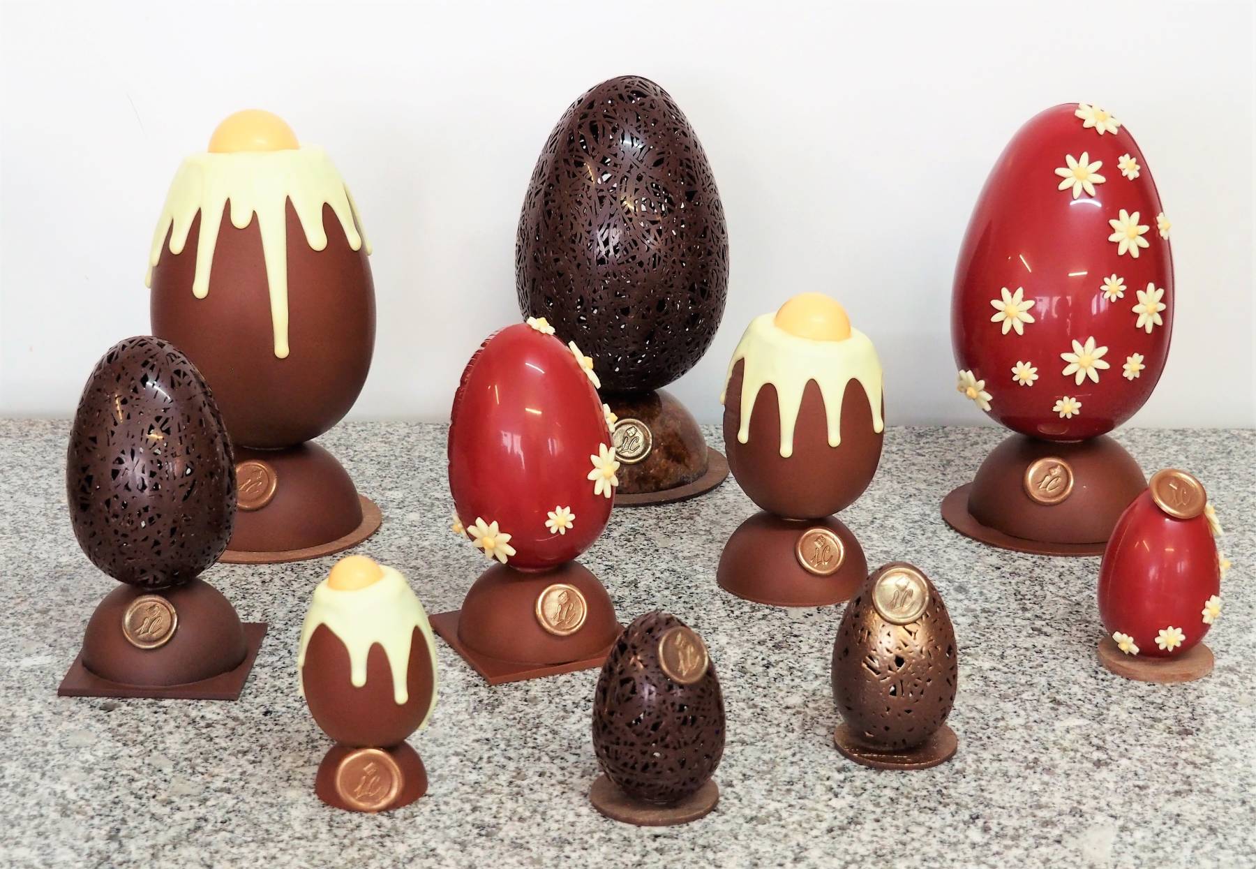 Les moulages sont garnis de fritures de la même couleur et d’oeufs pralinés en plus pour les grandes tailles, les créations artistiques ne sont pas garnies.